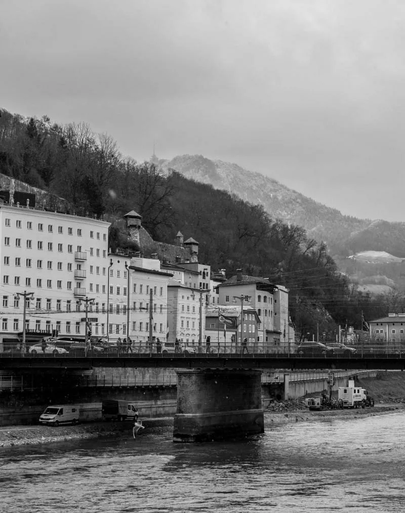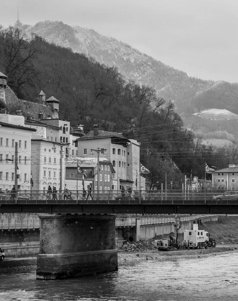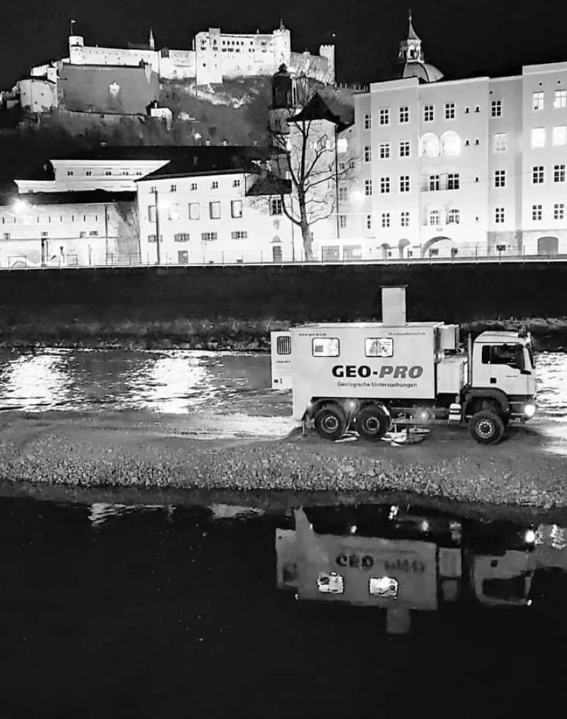 Besondere Maßnahme: die Sondierungen in der Salzach im Stadtzentrum fanden im Nachtschichtbetrieb statt. Wir nutzten die Niedrigwasserphase des Flusses im Jänner 2022, um einen temporären Dammkörper aufzuschütten und somit befahrbare Sondierplätze zu schaffen.